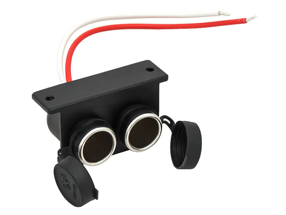 Przeznaczone do samodzielnego montażu podwójne gniazdo zapalniczki samochodowej zakończone przewodami.