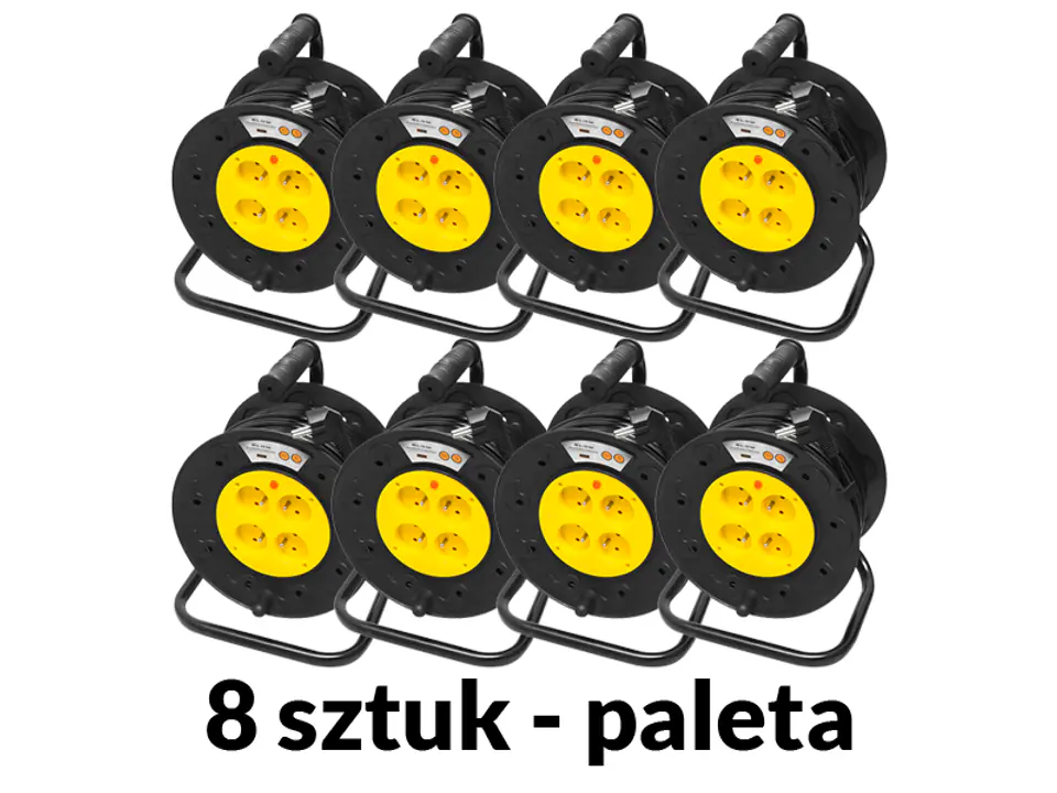 8 sztuk przedłużacza sieciowego PR-61 o długości 30 m na bębnie ze stojakiem i uchwytem oraz 4 gniazdami z uziemieniem.