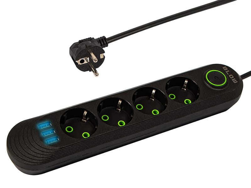 Przedłużacz sieciowy BLOW w kolorze czarnym z czterema gniazdami przeznaczony do użytku domowego. Przedłużacz pozwala podłączyć urządzenia, które są oddalone od gniazda elektrycznego. Produkt z jednej strony posiada 4 gniazda obrócone pod kątem oraz włącznik, a z drugiej pojedynczy kątowy wtyk sieciowy.