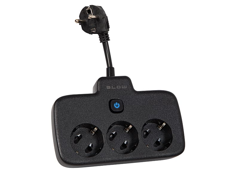 Przedłużacz sieciowy BLOW w kolorze czarnym z trzema gniazdami przeznaczony do użytku domowego. Przedłużacz pozwala podłączyć urządzenia, które są oddalone od gniazda elektrycznego. Produkt z jednej strony posiada 3 gniazda obróconych pod kątem oraz włącznik, a z drugiej pojedynczy kątowy wtyk sieciowy.