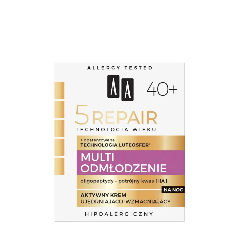 AA TECHNOLOGIA WIEKU 5 Repair to przełomowa seria aktywnych, multifunkcjonalnych kremów, która działa kompleksowo w pięciu najważniejszych obszarach, odpowiedzialnych za zachowanie młodego wyglądu skóry (nawilża, odbudowuje, wzmacnia, stymuluje i chroni). Innowacyjne luteosfery* wykorzystane w recepturach, stymulują wielokierunkowe procesy naprawczo-ochronne na poziomie komórkowym – działają antyoksydacyjnie oraz chronią komórki przed zanieczyszczeniami środowiska.