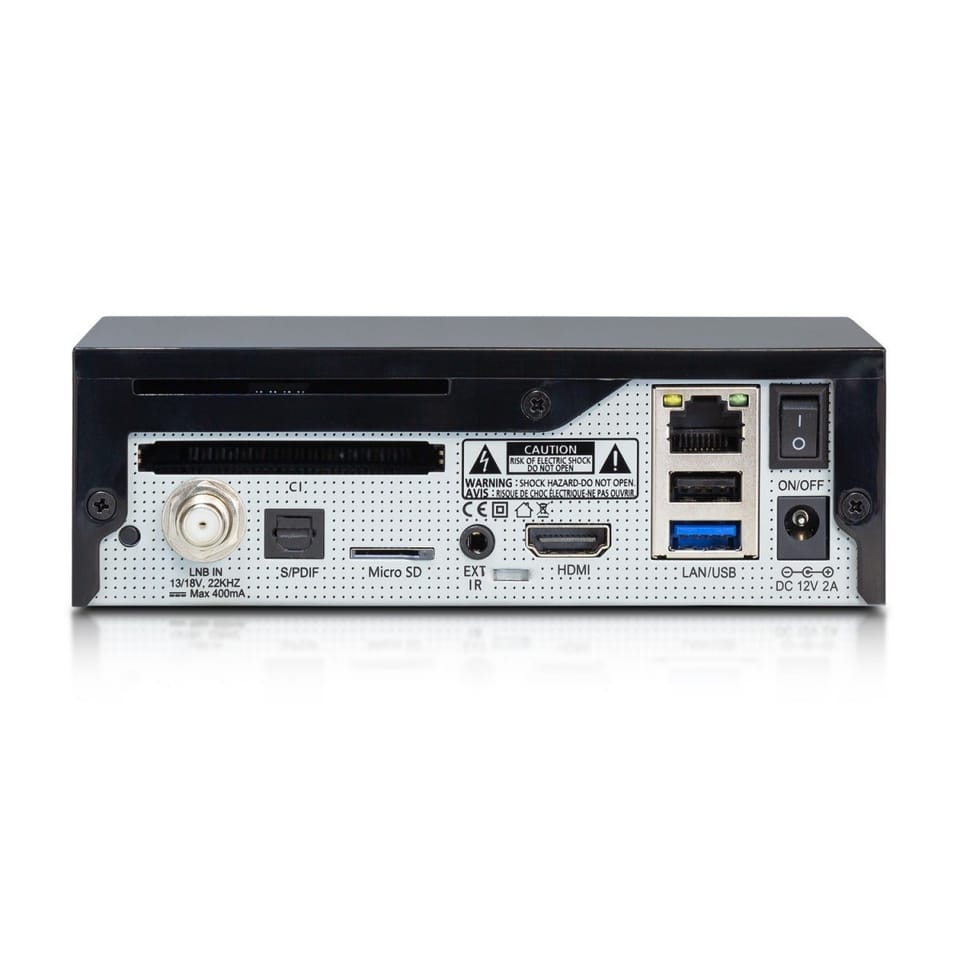 Elegancki i minimalistyczny design odbiornika wpasuje się w każdy salon. Na przednim panelu znajduje się dioda LED, która wskazuje, czy odbiornik jest włączony, wyłączony lub w trybie czuwania. W razie potrzeby można całkowicie wyłączyć oświetlenie LED. Na tylnym panelu wbudowany tuner satelitarny DVB-S2X, 1x slot na czytnik kart, 1x slot na moduł CI, 1x slot na kartę microSD, 1x USB 3.0, 1x USB 2.0. W wyposażeniu złącza znajdziemy również optyczne cyfrowe wyjście audio S/PDIF, Ethernet RJ45, sensor podczerwieni (w zestawie z odbiornikiem) oraz wejście dla zewnętrznego źródła DC 12V-2A.