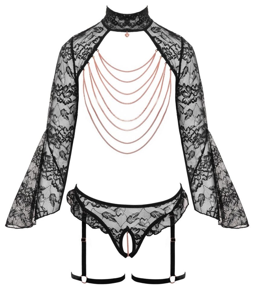 - Dwuczęściowy zestaw bielizny: bolerko z otwartymi miseczkami oraz majtki typu suspender briefs