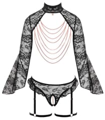 - Komplet obejmuje bolerko z otwartymi miseczkami oraz figi z wysokim stanem i pasem do pończoch