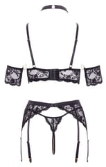 Abierta Fina Top Suspender Set S – Ekskluzywny Czarny Komplet z Koronki i Złotymi Akcentamibiustonosz typu toppas do pończochstringi z otwartą częścią dolnąkoronkowe paski na przedramionaPodsumowanie cech produktu:Zalety:Parametry techniczne: