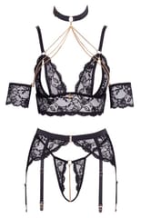 Abierta Fina Top Suspender Set S Czarny Koronkowy Komplet z Łańcuszkami