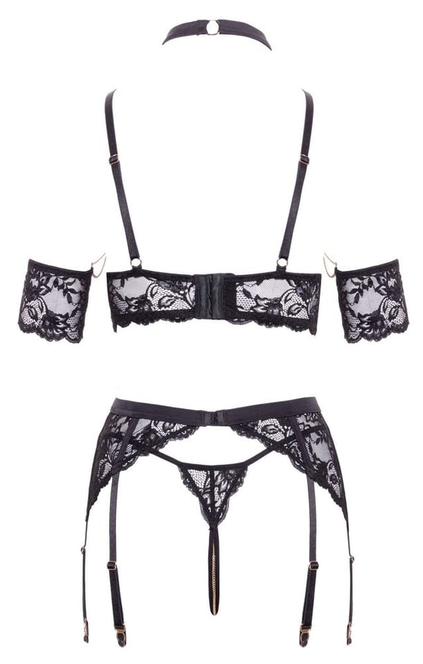- Komplet: top, pas do pończoch, stringi typu open, opaski na ramiona, choker