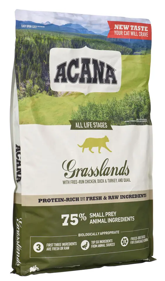 Koty wymagają diety bogatej w białko pochodzenia zwierzęcego. Taką potrzebę określa ich fizjologiczna budowa i drapieżna natura. Zainspirowana rozległymi, kanadyjskimi preriami i dziewiczymi jeziorami, ACANA Grasslands oferuje Twojemu kotu wysokiej jakości składniki zwierzęce, takie jak kurczak, indyk i kaczka chowane na wolnym wybiegu, ryby słodkowodne i jaja z chowu ściółkowego. Dzięki temu ACANA jest bogata w białko i składniki odżywcze pochodzące z mięsa mięśniowego, narządów wewnętrznych oraz chrząstek i kości obecnych w proporcjach WholePrey w naszym jedzeniu. To sprawia, że Twój kot otrzymuje wszystko, czego potrzebuje do osiągnięcia pełni zdrowia.