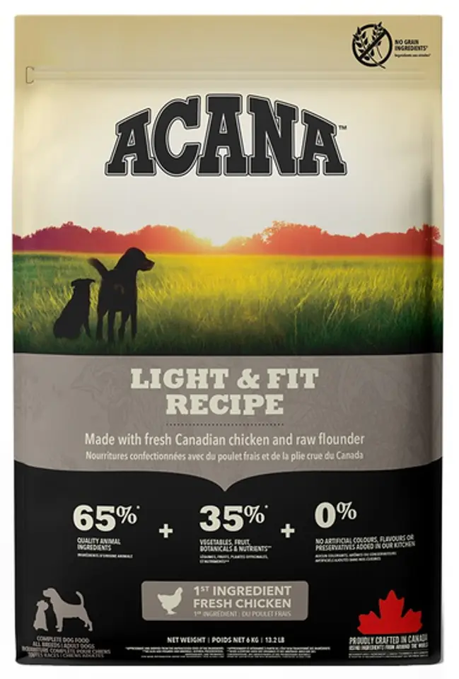 ACANA DOG przepełniona jest mięsem drobiu, odżywczymi jajami oraz rybami.Jedzenie ACANA DOG przygotowane jest zgodnie z naszymi Biologicznie Odpowiednimi standardami w naszej wielokrotnie nagradzanej kuchni NorthStar w Albercie, Kanada od 1985 roku. Myślimy, że je pokochasz, a co ważniejsze - pokocha je również Twój pies.Psy to mięsożercy. Są przystosowane do diety bogatej w białko zwierzęce, które zapewnia im szczytową kondycję i zdrowie.ACANA Light & Fit zawiera pełnowartościowe białko zwierzęce: kurczaka oraz morszczuka. Składniki te dostarczane są do naszej kuchni ŚWIEŻE lub SUROWE.WSZYSTKO O MIĘSIEUkład pokarmowy współczesnych psów jest zbudowany tak jak ich przodków. Uważamy, że powinny jeść tak jak oni. Psy i wilki zaspokajają swoje potrzeby żywieniowe poprzez spożywanie całych zdobyczy: mięso mięśniowe dostarcza białko, wątroba i żołądki dostarczają witamin i minerałów, a kości i chrząstki wapń oraz fosfor.Całkowicie wolna od glutenu, ACANA Light & Fit jest w 65% przepełniona składnikami zwierzęcymi wysokiej jakości – to prawie dwukrotność tego, co zawiera większość specjalistycznych karm dla psów.JAKA JEST RÓŻNORODNOŚĆ MIĘS?