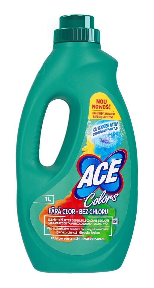 - Wstępna obróbka: Na wyjątkowo uporczywe plamy wylej niewielką ilość Ace bezpośrednio na zabrudzenie przed rozpoczęciem cyklu prania.