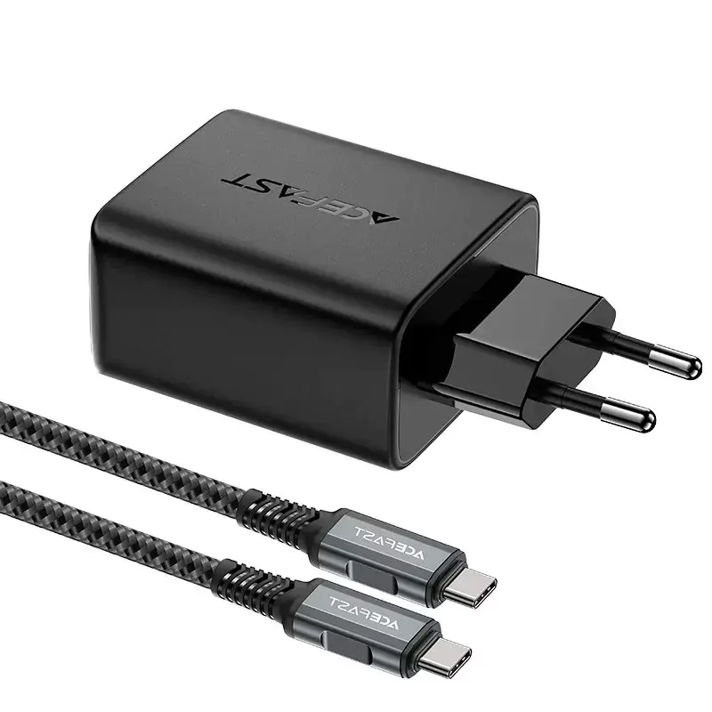 Szybka ładowarka sieciowa 2w1 marki Acefast. Posiada port USB Typ C, który umożliwia ładowanie z maksymalną mocą 65W oraz port USB 5W. Za pomocą wtyczki UBS Typ C można zasilać notebooki, które do pracy wymagają mocy o wartości do 65W (sprawdź specyfikację swojego komputera). Pozwala na szybkie ładowanie dwóch urządzeń jednocześnie m.in. w standardach PPS, Power Delivery, Quick Charge 3.0, AFC i FCP. Jest wykonana z ognioodpornego materiału PC. Została wyposażona w wiele zabezpieczeń takich jak np. przed przegrzaniem, przepięciem, wysokim napięciem czy przeciążeniem. W zestawie z ładowarką znajduje się kabel USB Typ C - USB Typ C o długości 1,8m. Elektroniczne komponenty ładowarki zostały wykonane w technologii GaN czyli są oparte na azotku galu, a nie na krzemie. GaN to lepsza efektywność pracy i mniejsze zużycie energii.