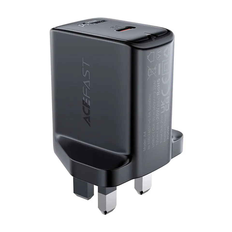 Szybka ładowarka sieciowa marki Acefast. Przeznaczona na rynek brytyjski, pasuje do gniazd typu UK. Posiada port USB Typ C, który umożliwia ładowanie z mocą do 20W. Pozwala na szybkie ładowanie urządzeń m.in. w standardach PPS, Power Delivery, Quick Charge 3.0, AFC i FCP. Jest wykonana z ognioodpornego materiału PC. Została wyposażona w wiele zabezpieczeń takich jak np. przed przegrzaniem, przepięciem, wysokim napięciem czy przeciążeniem.