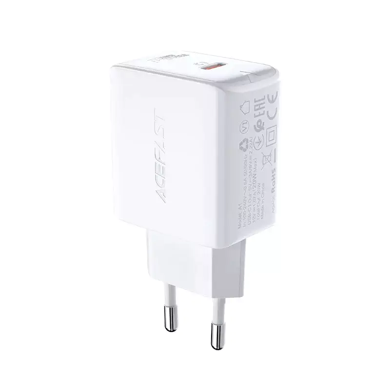 Szybka ładowarka sieciowa marki Acefast. Posiada port USB Typ C, który umożliwia ładowanie z mocą do 20W. Pozwala na szybkie ładowanie urządzeń m.in. w standardach PPS, Power Delivery, Quick Charge 3.0, AFC i FCP. Jest wykonana z ognioodpornego materiału PC. Została wyposażona w wiele zabezpieczeń takich jak np. przed przegrzaniem, przepięciem, wysokim napięciem czy przeciążeniem.