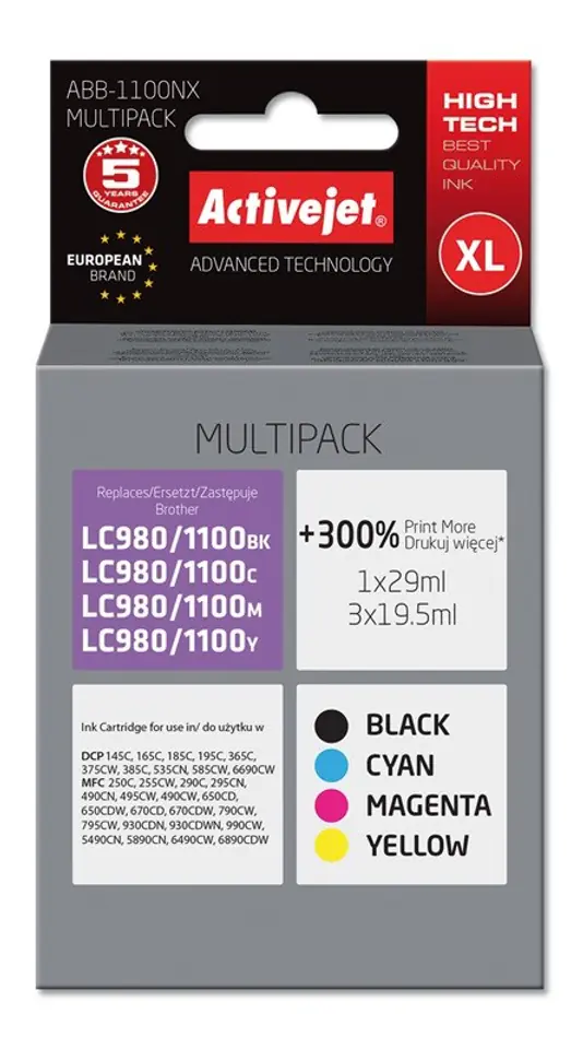 Activejet ABB-1100NX Tusz zamiennik Brother LC1100/980; Supreme; 1 x 29 ml, 3 x 19.5 ml; czarny, czerwony, niebieski, żółty