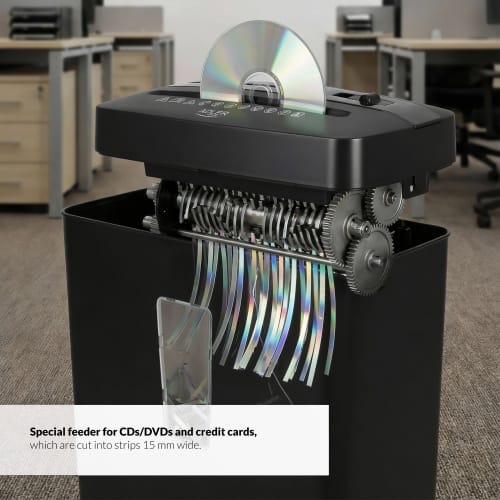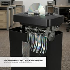 • Specjalny oddzielny podajnik na płyty CD/DVD oraz karty kredytowe, które są cięte na paski o szerokości 15 mm.
