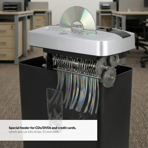 - Specjalny oddzielny podajnik na płyty CD/DVD oraz karty kredytowe, które są cięte na paski o szerokości 15 mm.