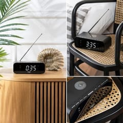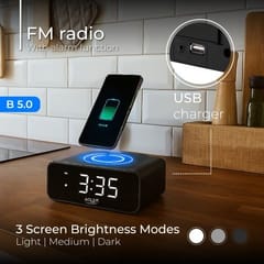 Estetyczny i głośny budzik z ładowarką bezprzewodowe i radiem FM. Pokazywana godzina jest doskonale widoczna, dzięki wyraźnemu wyświetlaczowi. Budzik zasilany jest z sieci elektrycznej, ma też wbudowane bateryjne zasilanie podtrzymania pamięci. Technologia Bluetooth 5.0 oraz wejście AUX, a także wbudowane głośniki stereo o wysokiej wydajności umożliwiają słuchanie krystalicznych dźwięków ulubionej muzyki z niemal każdego źródła. Dodatkowo budzik ma wbudowane radio, w którym można zaprogramować aż do 30 stacji.