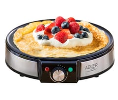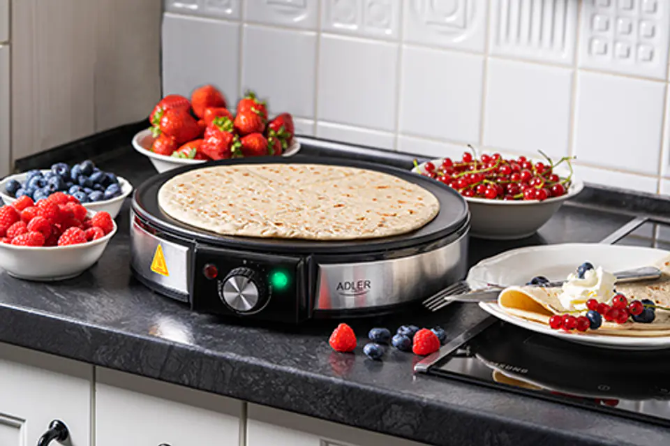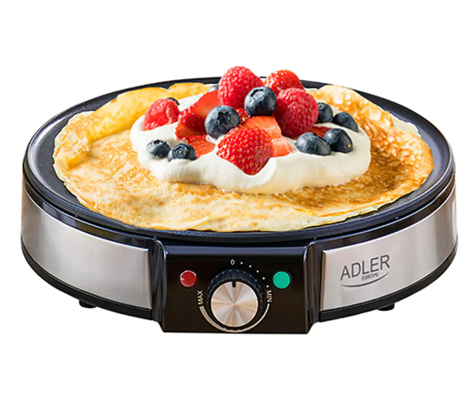 Naleśnikarka ADLER AD 3058 to urządzenie, które znajdzie zastosowanie w większości domów. W szybki i wygodny sposób przyrządzisz przekąski na śniadanie i podwieczorek oraz główne danie na obiad. Średnica płyty grzewczej urządzenia to 30 cm. Nieprzywierająca powłoka płyty grzewczej, kształt oraz wysoki rant zapobiegający wylaniu ciasta ułatwią smażenie naleśników, ale również tortilli, racuchów i placków ziemniaczanych. Urządzenie umożliwia płynną regulację temperatury, a dwie lampki kontrolne sygnalizują, gdy sprzęt jest gotowy do pracy. W zestawie znaleźć można również akcesoria do rozprowadzania ciasta i odwracania naleśników.