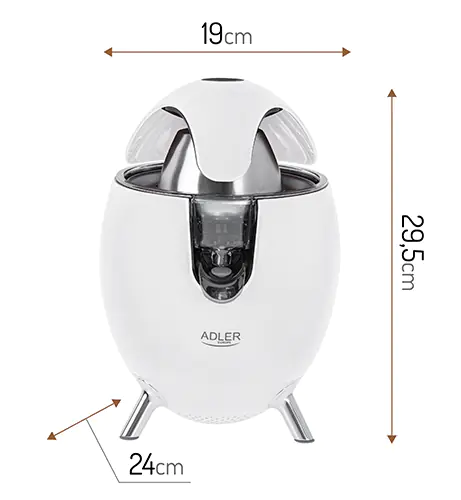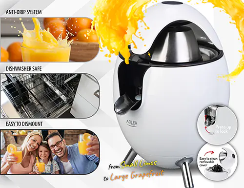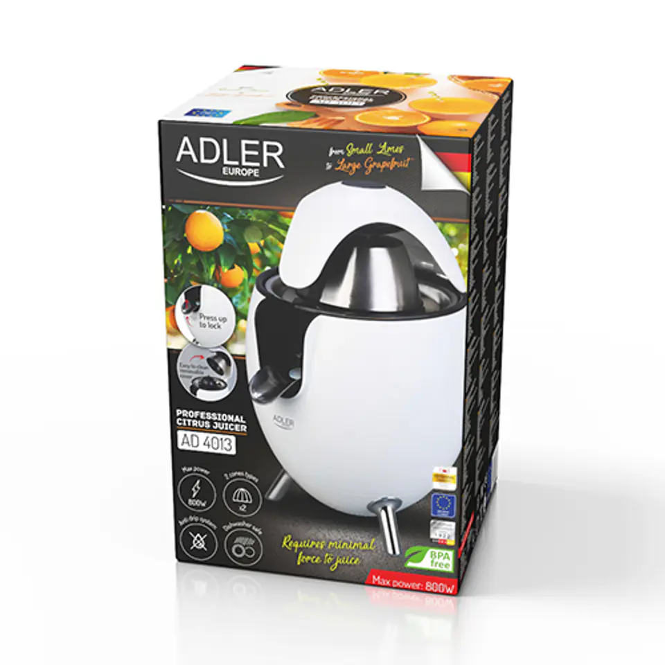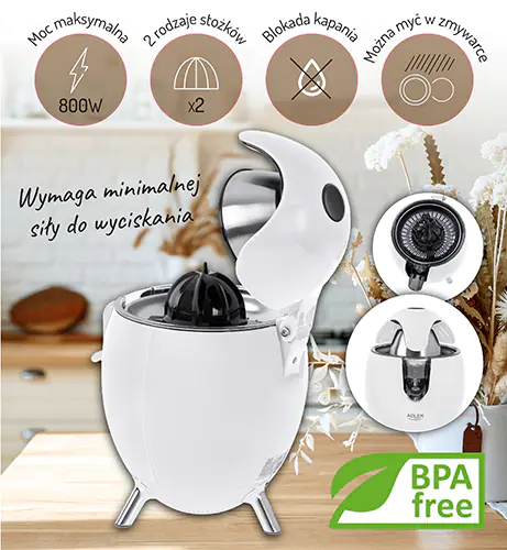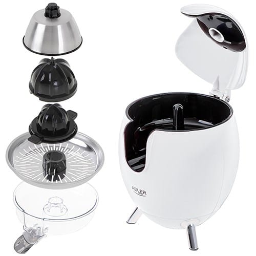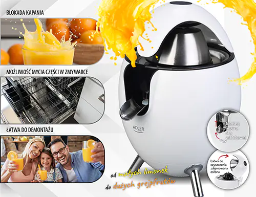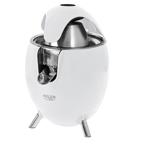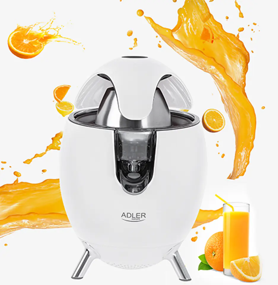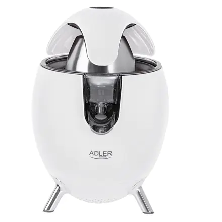 Estetyczna wyciskarka do cytrusów Adler 4013 o mocy 800 W. Pozwala na sprawne przygotowanie świeżego soku z cytryn, pomarańczy i grejpfrutów. Pokrywa ochronna zapobiega rozpryskiwaniu się soku po stole lub blacie kuchennym. Wyciskarka posiada 2 stożki wyciskające, odpowiednie dla owoców o różnej średnicy. Urządzenie składa się stabilnej podstawy, przykrywki, sitka oddzielającego sok od miąższu oraz dwóch wymiennych stożków wyciskających. Sitko gwarantuje płyn bez pływających w nim cząstek i pestek z owoców. Natomiast stożki ułatwiają wyciskanie soku z mniejszych i większych cytrusów, co ma szczególne znaczenie, jeśli jesteśmy miłośnikami soków grejpfrutowych. Wygoda i prostota użytkowania produktu sprawią, że będzie to idealny zakup dla każdego, kto ceni zdrowe odżywianie i świeże nieprzetworzone soki jako uzupełnienie diety. Elegancki wygląd i możliwość mycia wyjmowanych części w zmywarce czynią ją idealną do każdego rodzaju kuchni. Dzióbek pozwala wyciskać sok bezpośrednio do szklanki z herbatą lub na sok.