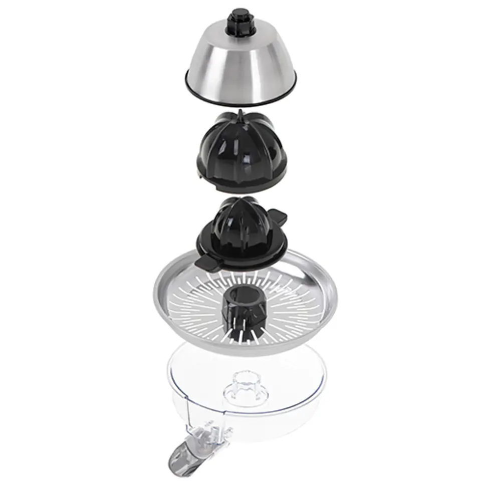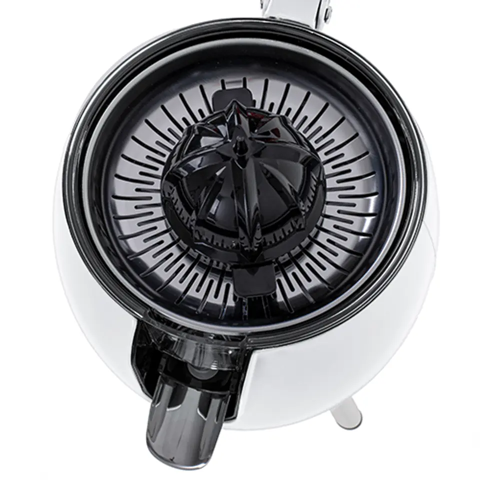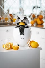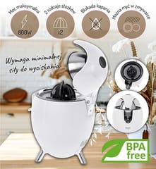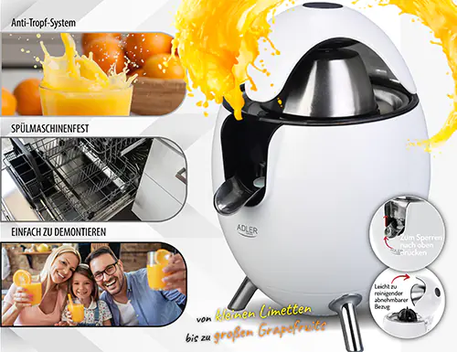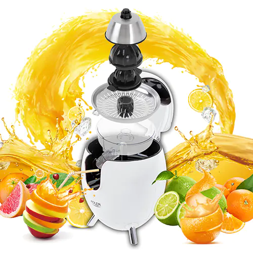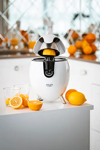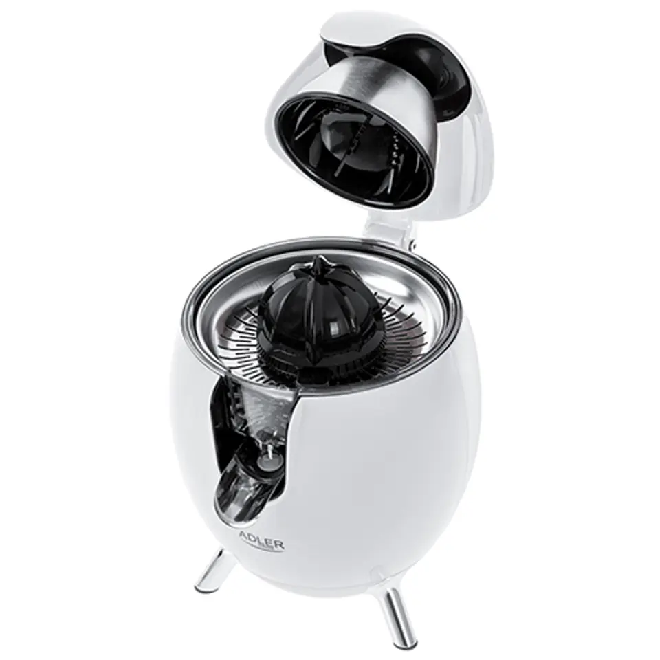 Estetyczna wyciskarka do cytrusów Adler 4013 o mocy 800 W. Pozwala na sprawne przygotowanie świeżego soku z cytryn, pomarańczy i grejpfrutów. Pokrywa ochronna zapobiega rozpryskiwaniu się soku po stole lub blacie kuchennym. Wyciskarka posiada 2 stożki wyciskające, odpowiednie dla owoców o różnej średnicy. Urządzenie składa się stabilnej podstawy, przykrywki, sitka oddzielającego sok od miąższu oraz dwóch wymiennych stożków wyciskających. Sitko gwarantuje płyn bez pływających w nim cząstek i pestek z owoców. Natomiast stożki ułatwiają wyciskanie soku z mniejszych i większych cytrusów, co ma szczególne znaczenie, jeśli jesteśmy miłośnikami soków grejpfrutowych. Wygoda i prostota użytkowania produktu sprawią, że będzie to idealny zakup dla każdego, kto ceni zdrowe odżywianie i świeże nieprzetworzone soki jako uzupełnienie diety. Elegancki wygląd i możliwość mycia wyjmowanych części w zmywarce czynią ją idealną do każdego rodzaju kuchni. Dzióbek pozwala wyciskać sok bezpośrednio do szklanki z herbatą lub na sok.