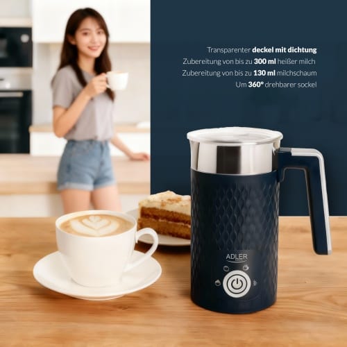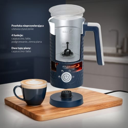 Spieniacz do mleka ADLER AD 4494 to urządzenie, dzięki któremu samodzielnie przygotujemy piankę do kawy niczym z najlepszej kawiarni. Sprawdzi się idealnie do przygotowania piany do cappuccino, latte oraz do gorącej czekolady i napojów na zimno. Jeśli lubisz naprawdę gorącą kawę, ucieszy Cię fakt, że urządzenie samo podgrzewa mleko i jednocześnie spienia, dzięki czemu powstaje kremowa pianka. Urządzenie posiada 4 funkcje: cappuccino, latte, podgrzewanie, zimna piana. Możesz przygotować do 300 ml gorącego mleka lub do 130 ml pianki mlecznej. Spieniacz do mleka AD 4494 jest bardzo prosty w obsłudze, a powłoka nieprzywierająca sprawi, że umycie kubka zajmie tylko kilka chwil. Przezroczysta pokrywka z uszczelką uchroni przed rozpryskiem oraz pozwala na bieżąco kontrolować proces spieniania. Spieniacz dzięki białej obudowie oraz srebrnym elementom wykończeniowym prezentuje się wyjątkowo elegancko.
