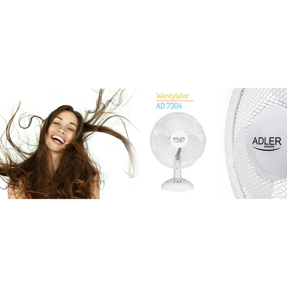 Wydajny wentylator o mocy 90W. Wpływa na ochłodzenie pomieszczenia i zapewnienie w nim większej ilości świeżego powietrza. Posiada stabilną podstawę, co sprawia, że może być postawiony nawet na nierównej powierzchni bez obawy o przewrócenie. Dzięki obrotowej głowicy, jedno urządzenie może objąć zasięgiem większy obszar. Regulacja kąta nachylenia daje możliwość pionowej zmiany kierunku nadmuchu. Wentylator AD 7304 posiada duży wiatrak o średnicy 40 cm, co zwiększa powierzchnię jednoczesnego nadmuchu a trzy prędkości pozwalają zadecydować o jego sile.