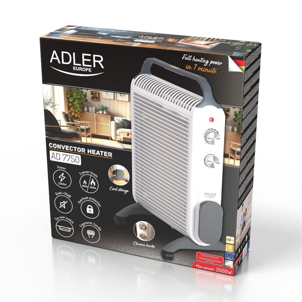 Zapewnij sobie przytulne ciepło i komfort w każdym pomieszczeniu dzięki grzejnikowi konwektorowemu Adler 7750. Nasz nowoczesny grzejnik został zaprojektowany z myślą o skutecznym i szybkim ogrzewaniu, abyś mógł cieszyć się przyjemną temperaturą dokładnie tam, gdzie jej potrzebujesz. Odczuj ciepło już po 1 minucie! Grzejnik Adler 7750 to efektywność w akcji, zapewniający natychmiastowe i wydajne ogrzewanie, kiedy tylko tego potrzebujesz. Dzięki zaawansowanej technologii konwekcyjnej, nasz grzejnik równomiernie rozprowadza ciepłe powietrze, co sprawia, że pomieszczenie szybko osiąga komfortową temperaturę. Niezależnie od tego, czy wolisz ciepło na wyciągnięcie ręki, czy chcesz utrzymać stałą temperaturę, termostat w grzejniku Adler 7750 pozwala na łatwą regulację, dostosowaną do Twoich preferencji. Wybierz spośród dwóch dostępnych poziomów mocy - 1000W lub 2000W - aby dostosować ogrzewanie do aktualnych warunków i potrzeb. Chromowane pokrętła nie tylko dodają elegancji, ale także umożliwiają precyzyjne dostosowanie ustawień grzejnika. Intuicyjna lampka sygnalizacyjna informuje o aktywności grzejnika, pozwalając łatwo monitorować jego działanie. Grzejnik Adler 7750 został wyposażony w ochronę przed przegrzaniem oraz zabezpieczenie przed przewróceniem, zapewniając Ci pełny spokój ducha podczas korzystania z urządzenia.