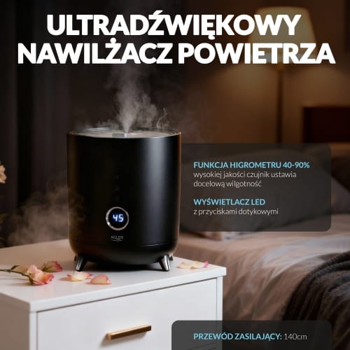 Oprócz tego, nawilżacz Adler 7972 został wyposażony w funkcję higrometru, który precyzyjnie ustawia docelową wilgotność w zakresie od 40% do 90%. Zaawansowany czujnik braku wody zapewnia bezpieczeństwo użytkowania, automatycznie wyłączając urządzenie w przypadku wyczerpania zasobów wody.Dzięki timerowi możesz dostosować czas pracy nawilżacza do swoich potrzeb, wybierając spośród opcji automatycznego wyłączania po 1, 2, 4 lub 6 godzinach. Trzy-stopniowa regulacja intensywności nawilżania pozwala na dopasowanie działania urządzenia do wielkości i warunków pomieszczenia.Zbiornik na wodę o dużej pojemności 4,0 litrów oraz długi czas pracy na jednym napełnieniu wynoszący ponad 13 godzin gwarantują długotrwałe i efektywne nawilżanie.