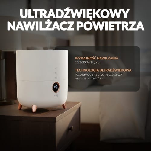 Największą zaletą tego nawilżacza jest jego inteligentny system zarządzania nawilżaniem. Gdy wilgotność pomieszczenia odchyla się o 5% od wyznaczonego poziomu, nawilżacz automatycznie uruchamia lub zatrzymuje proces nawilżania, dbając o utrzymanie optymalnych warunków w Twoim otoczeniu.Dzięki technologii ultradźwiękowej, nawilżacz rozbija wodę na mikroskopijne cząsteczki mgły o średnicy 1-5 mikrometrów, które delikatnie unoszą się w powietrzu, skutecznie zwiększając wilgotność. Ciesz się zdrowym i przyjemnym oddychaniem dzięki funkcji aromaterapii, która umożliwia dodawanie olejków eterycznych.