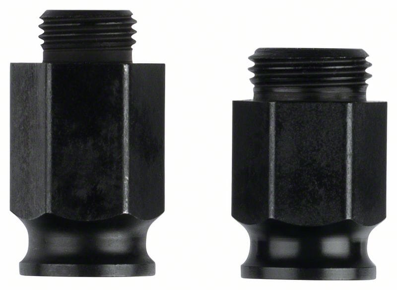 Tekst produktu, osprzęt szary: 6-częściowy zestaw adapterów do otwornic standardowych konkurencyjnych marek (np. Starrett, Baco, Lenox itp.) z 2 adapterami do O 14-30 mm (gwint 1/2" 20 UNF), 4 adaptery do O 32-210 mm (gwint 5/8" 18 UNF)