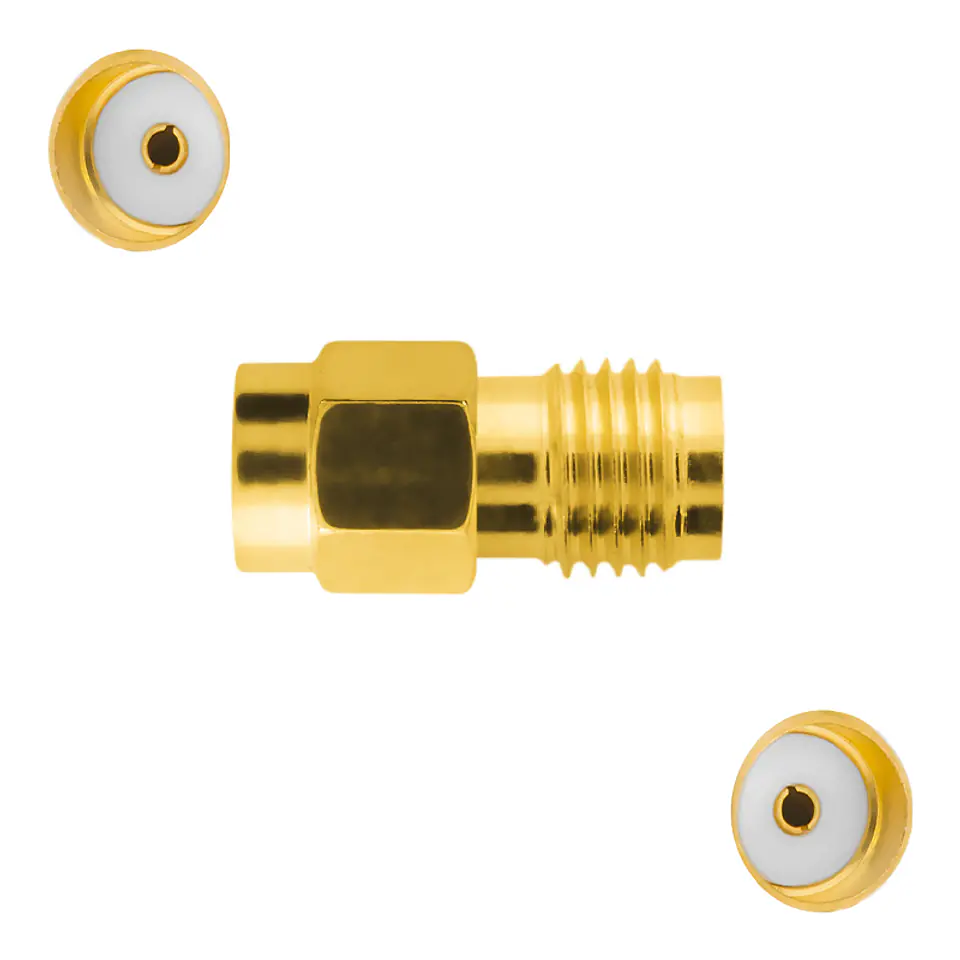 Przejście z wtyku RP-SMA na gniazdo SMA. Umożliwia dopasowanie koncówek przy podłaczaniu anten do nadajników i odbiorników.