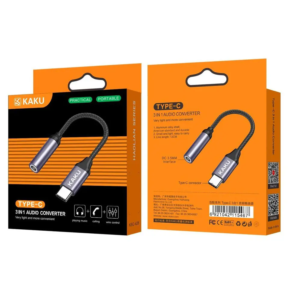 KAKU KSC-428 - adapter z kablem ze złącza USB-C na gniazdo słuchawkowe 3,5 mm. Umożliwia podłączenie słuchawek do smartfona, a co za tym idzie słuchanie naszej ulubionej muzyki. Praktyczne rozwiązanie dla urządzeń wyposażonych wyłącznie w port USB-C.