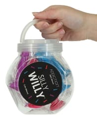 12 naughty mini dildos! Addiction Silly Willy presents 12 colourful mini dildos in a beautiful candy jar with screw cap. Perfect eye-catcher on the sales counter to trigger impulse purchases in the checkout area (take-away product).Each mini penis dildo is made true to life and of high-quality silicone. Each with an extra strong suction cup - sticks firmly and securely to any smooth surface. Cheeky gag for kitchen, office, bathroom, JGA, party – and of course for erotic play!12 mini dildos in total – 4 each in blue, purple and red.Each 8.4 cm long.Silicone.