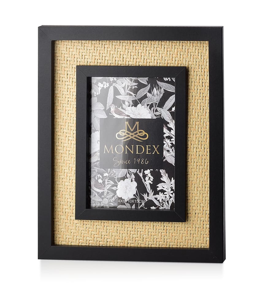 Ramka na zdjęcia z serii ADI marki MONDEX. Wykonana z MDF-u. Rama jest w kolorze czarnym wypełnionym plecionką w odcieniu naturalnym beżowym, słomkowym. Rozmiar zdjęcia to 10x15cm. Ramkę można postawić jak również powiesić w pionie lub poziomie. Zapakowana jednostkowo w folię. Wymiar całości: DŁUGOŚĆ ł 25.00 cm SZEROKOŚĆ ł 20.00 cm WYSOKOŚĆ ł 2.00 cm