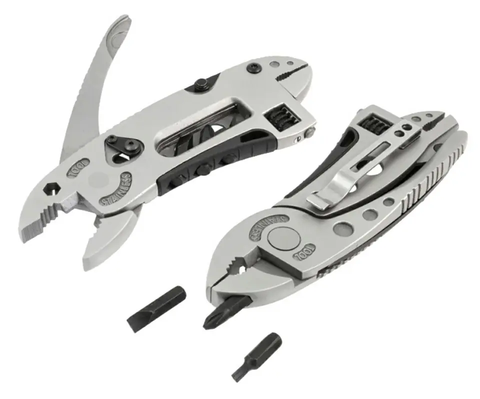 - Multitool zawiera w sobie szereg przydatnych narzędzi szczególnie przydatnych na wyjazdach, wycieczkach, obozach, campingach lub np. w samochodzie.