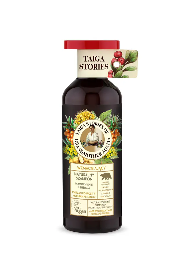 Eurobio Lab to wschodnioeuropejski producent kosmetyków opartych na naturalnych i organicznych składnikach. Receptury Babuszki Agafii Taiga Stories to linia kosmetyków oparta na staranie wyselekcjonowanych ziołach pochodzących z Tajgi. Naturalny, wzmacniający szampon do włosów osłabionych i cienkich z chrzanem i modrakiem abisyńskim. Chrzan Pospolity nadaje włosom witalność i wspomaga wzrost nowych włosów. Ma silne działanie pobudzające i rewitalizuje cebulki włosów. Odbudowuje ich strukturę, dzięki czemu stają się gęstsze i gładsze. Modrak Abisyński wzmacnia włosy, starannie dba o ich strukturę, dodaje im grubości i wygładza. Świeże zioła pochodzące z tajgi dzięki wysokiej zawartości witamin, odżywiają i wzmacniają włosy oraz dodają im naturalnej objętości i blasku. Składnik myjący na bazie mydlnicy lekarskiej wspomaga zachowanie świeżości włosów na dłużej. Produkt posiada oznaczenie Vegan nadawane przez Towarzystwo Wegańskie. Oznacza to, że w produkcie nie ma składników pochodzenia zwierzęcego – nawet mleka lub miodu. Oprócz tego produkt ani jego składniki nie były testowane na zwierzętach.