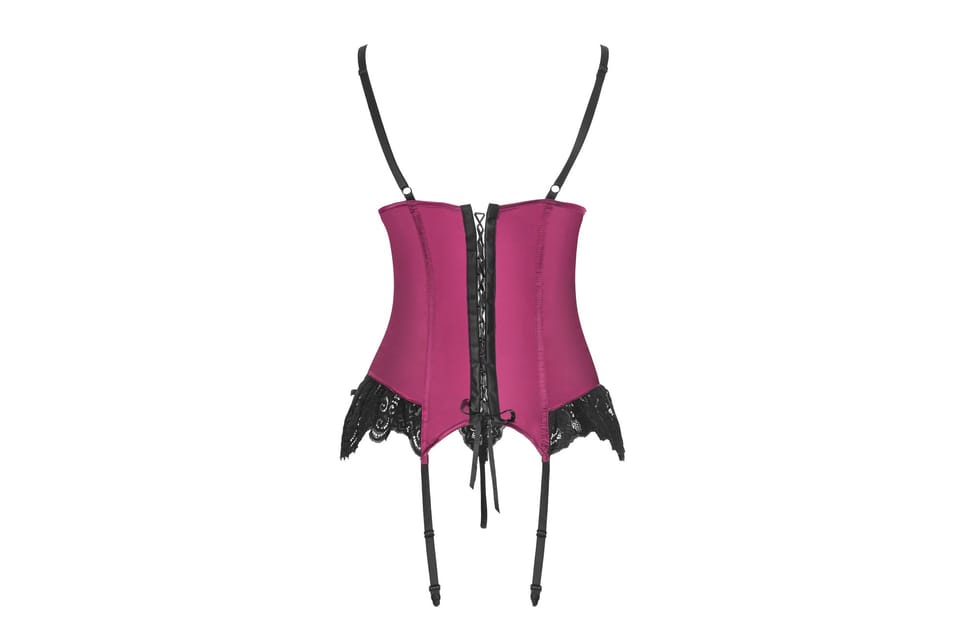 Bardzo wytworny gorset na cienkich, regulowanych ramiączkach, z miękkiej satyny w bordowym kolorze. Ozdobiony przy głębokim dekolcie i u dołu misterną, czarną koronką. Smukłości dodają pionowe fiszbiny, z tyłu wiązanie satynową tasiemką. W komplecie koronkowe stringi w kolorze czerni.