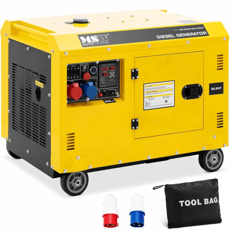 Kod producenta: 10062297Agregat prądotwórczy Diesel MSW zapewnia niezbędną energię elektryczną w przypadku wystąpienia przerw w dostawie prądu. Umożliwia to mocny 4-suwowy silnik wysokoprężny. Urządzenie zużywa tylko 30 l paliwa na 12 godzin. Sprzęt pracuje z mocą 7220 / 8500 W. Dzięki trzem gniazdom (240/400 V i 12 V) można nim obsługiwać kilka różnych maszyn, nawet równolegle. Maksymalna moc gniazda 230 V wynosi 7220 W, a gniazda 400 V to 8500 W. Dzięki temu sprzęt idealnie sprawdza się w sytuacjach awaryjnych w domu, w biurze, na kempingu, na łodzi lub w sektorze przemysłowym. Generator włącza się za pomocą elektrycznego rozrusznika. Wszystkie ustawienia można odczytać z wyświetlacza podczas pracy w czasie rzeczywistym. Urządzenie działa z głośnością od 78 do 96 dB. Jednostka napędowa jest bezpiecznie wykonana i czysto wykończona. Efektywne chłodzenie powietrzem chroni silnik przed przegrzaniem. Zabezpieczenie przed przeciążeniem zapobiega uszkodzeniu silnika w przypadku przegrzania. Dzięki klasie ochrony IP23 agregat jest chroniony przed rozpryskami wody pod kątem do 60deg;. Urządzenie zabezpieczono także przed ciałami stałymi o średnicy do 12,5 mm. Duży zbiornik zapewnia długie zasilanie, nawet przy znacznych obciążeniach. Kompaktowy agregat z silnikiem wysokoprężnym jest wyposażony w regulator napięcia AVR, wyłącznik awaryjny, czujnik niskiego ciśnienia oleju i pilot zdalnego sterowania.Cechy produktu: