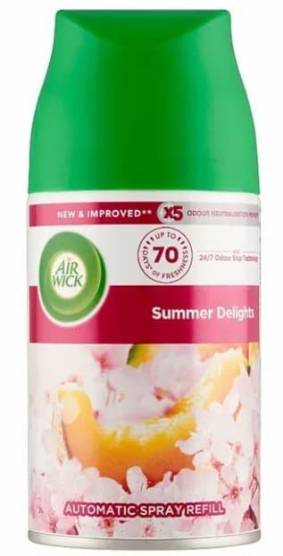 Air Wick Freshmatic Summer Delights to wkład do automatycznego odświeżacza powietrza, który wprowadzi do Twojego domu letnią świeżość. Połączenie owocowych nut cytrusów, kwiatów i subtelnych zapachów przypominających wakacyjne dni, zapewni Ci przyjemną atmosferę przez cały dzień.