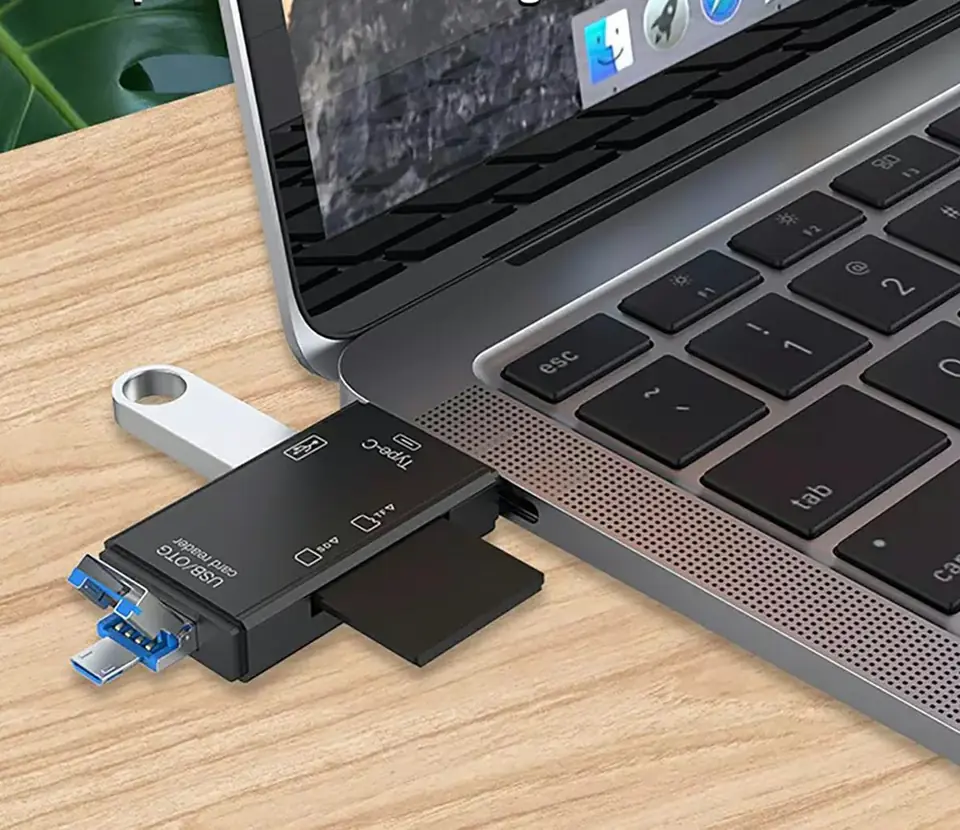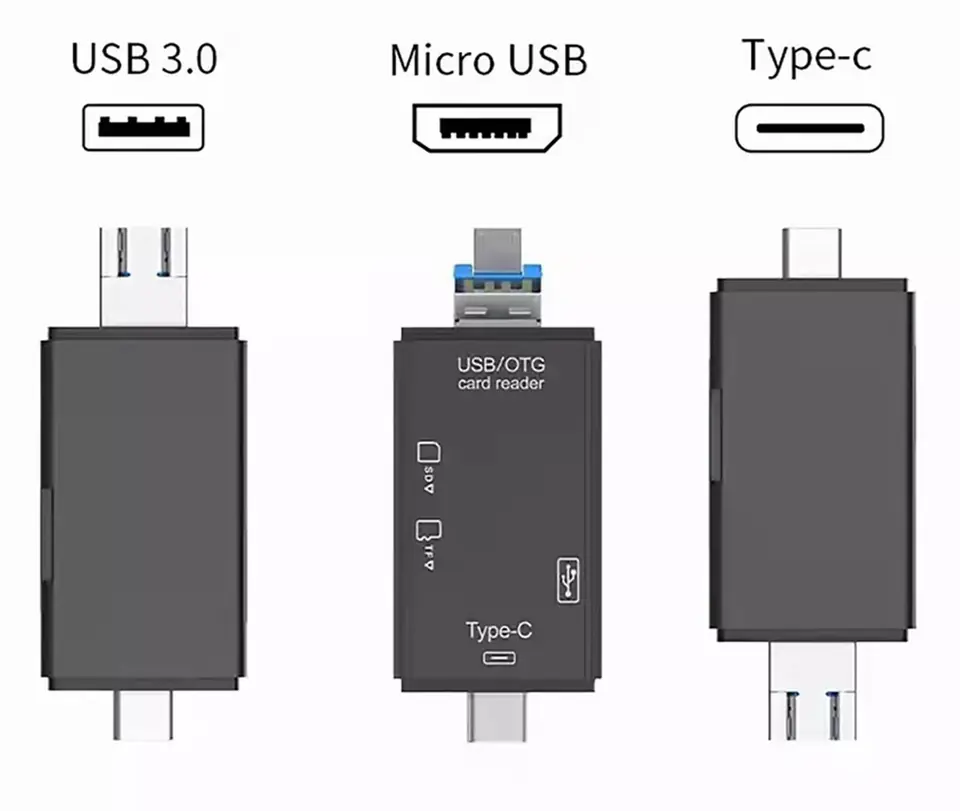 - Czytnik posiada 3 porty USB (USB typu A, micro-USB oraz USB-C) co ułatwia podłączenie go do w zasadzie dowolnego urządzenia (jak np. smartfon).