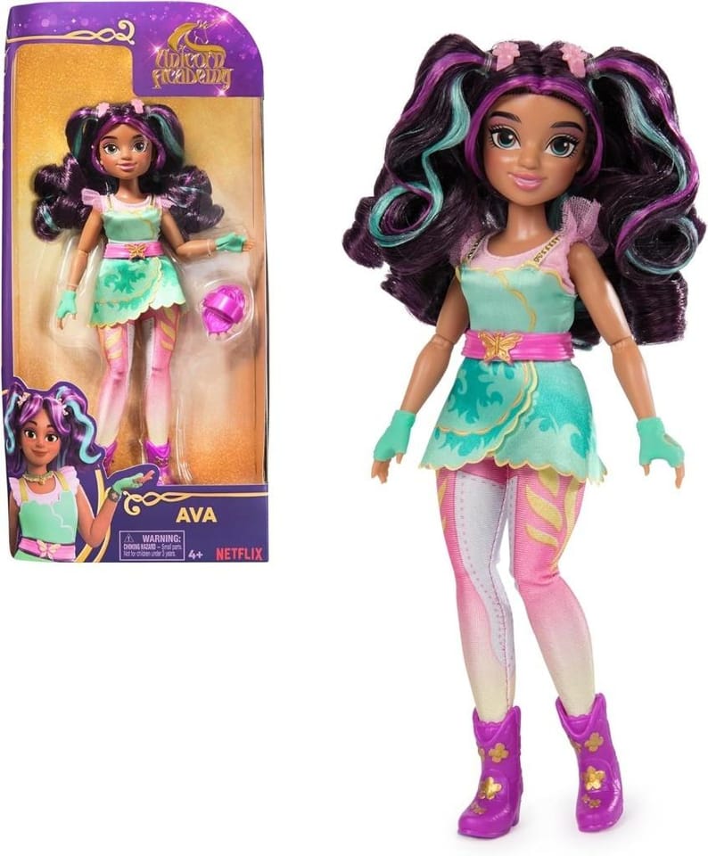 Stwórz w domu czarujące przygody w Akademii Jednorożców z lalkami Sophii, Isabel i Avy! Zainspirowane serialem animowanym NETFLIX i ulubioną przez dzieci serią książek o przyjaźni, te 23 cm lalki dla dziewczynek ożywią bohaterów znanych z ekranu. Pięknie dopracowana od stóp do głów lalka reprezentująca Avę podkreśla jej przyjazną osobowość poprzez rozjaśnione włosy (akcesoria do stylizacji w zestawie) i jej charakterystyczny strój jeźdźczyni jednorożców: różowo-turkusową sukienkę w płatki, krótkie legginsy z oznaczeniami Magii Roślin, kwieciste buty i spinki do włosów, rękawiczki i pasek w motyle! Mając do dyspozycji 9 punktów zgięcia, nadawaj Avie różne pozy podczas zabawy w obronę Wyspy Jednorożców i jej magii i ruszaj na przygodę z jej jednorożcem, Listką (sprzedawanym oddzielnie)! Magiczne więzi między uczniami Akademii Jednorożców i ich wierzchowcami pobudzą wyobraźnię do tworzenia niekończących się historii. Aby uzyskać więcej sposobów na poznanie Akademii Jednorożców i ulubionych postaci, poszukaj lalek Isabel i Sophii oraz ich jednorożców, Wirka i interaktywnej Gwiazdy (każdy sprzedawany osobno), aby rozbudować świat znany z książek i serialu! Zabawki z serii Akademia Jednorożców to wspaniałe prezenty świąteczne lub okolicznościowe dla dzieci, które lubią zabawkowe jednorożce i konie, lalki i akcesoria, domki dla lalek, przedmioty kolekcjonerskie, pluszaki i nie tylko. Przynieś do domu magię Akademii Jednorożców z lalką Avą!