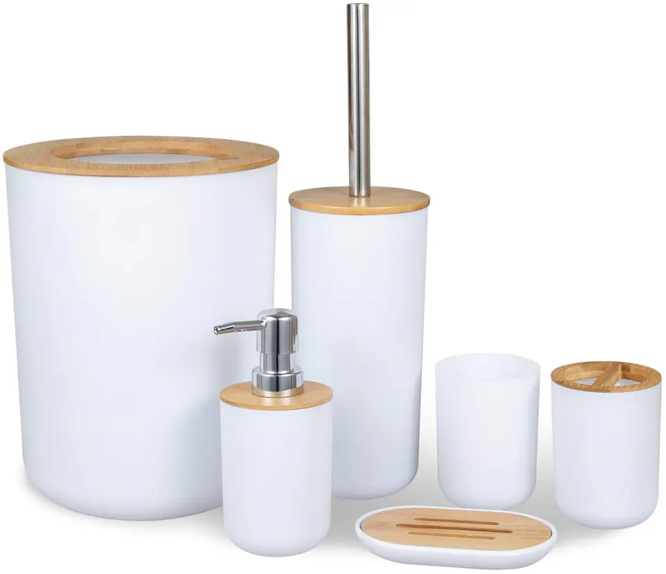 Akcesoria łazienkowe Timor komplet 6 sztuk białyPrzeznaczenie: łazienka | Kolory: biały, bambus naturalny Idealny zestaw akcesoriów do łazienki. W skład kompletu wchodzi sześć elementów:dozownik mydła, kubek na szczoteczki do zębów kosz na śmieci, kubek łazienkowy do płukania ust, mydelniczka, szczotka do WC, pojemnik na śmieci. Starannie wykonany, ma opływowe kształty, dzięki czemu nie tylko wpisuje się w najnowsze trendy wnętrzarskie i bardzo łatwo utrzymać go w czystości. Jasne, ozdobne elementy wykonano z naturalnego bambusa. Dzięki temu bardzo łatwo będzie znaleźć inne, pasujące dodatki w tym kolorze. Bambus jest obecnie bardzo popularnym i chętnie wybieranym materiałem przy urządzaniu nowoczesnych i modnych wnętrz. Sprawdzi się doskonale w stylu loftowym, nowoczesnym, klasycznym. Zawartość zestawu:dozownik mydłakosz na śmiecikubek łazienkowy do płukania ustkubek na szczoteczki do zębówmydelniczkaszczotka do WCSpecyfikacja:materiał pojemników: PP (polipropylen)materiał pokrywek: 100% bambuswaga zestawu: 1,1 kgprzeznaczenie: łazienkaWymiary:kubek na szczoteczki: 7,5x11 cm kubek łazienkowy: 7,5x10,5 cmmydelniczka: 13,5x8,5 cmkosz na śmieci: 19,5x26 cmstojak ze szczotką wc: 10x36 cmdozownik mydła: 7,5x16,5 cm Informacje dodatkowePrzedstawione kolory należy traktować poglądowo - mogą odbiegać od rzeczywistych ze względu na różne ustawienia monitorów oraz proces obróbki zdjęć. Rzeczywiste wymiary mogą się różnić od podanych wyżej. Tolerancja błędów może wynosić +/- 5%.Marka:GockowiakKod EAN:324905MGKolor:biały, naturalne drewnoMateriał: tworzywo, bambusIlość elementów:6
