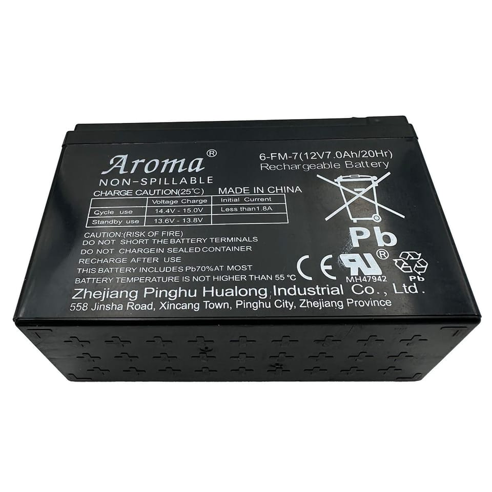 - Napięcie nominalne: 12 VPojemność: 7,0 AhPraca cykliczna: 14.4 – 15.0 VStan czuwania: 13.6 – 13.8 VPrąd inicjacji: mniejszy niż 1.8 AWymiary: 15 x 6,5 x 9,5 cm (dł. x szer. x wys.)Waga netto: 2,045 kgWaga brutto: 2,1 kgWymiary opakowania: 16 x 7 x 10 cm (dł. x szer. x wys.)Model: Aroma 6-FM-7(12V7.0Ah/20Hr)Certyfikat CE: tak