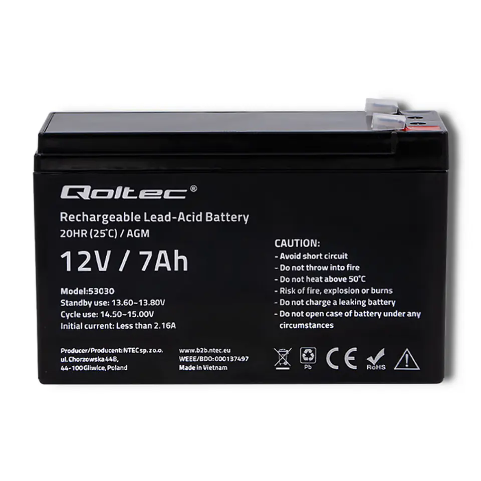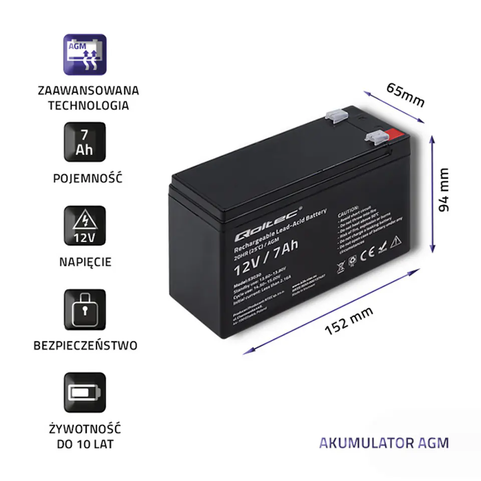 Akumulator żelowy Qoltec charakteryzuje się najlepszą jakością oraz wykonaniem z wysokiej jakości materiałów. Zastosowano nowoczesną technologię AGM, w którym płynny elektrolit jest umieszczony w separatorze wykonanym z maty szklanej. Cechuje się powolnym procesem rozładowywania, szczelnością oraz wysoką odpornością na temperatury, wibracje i uderzenia.