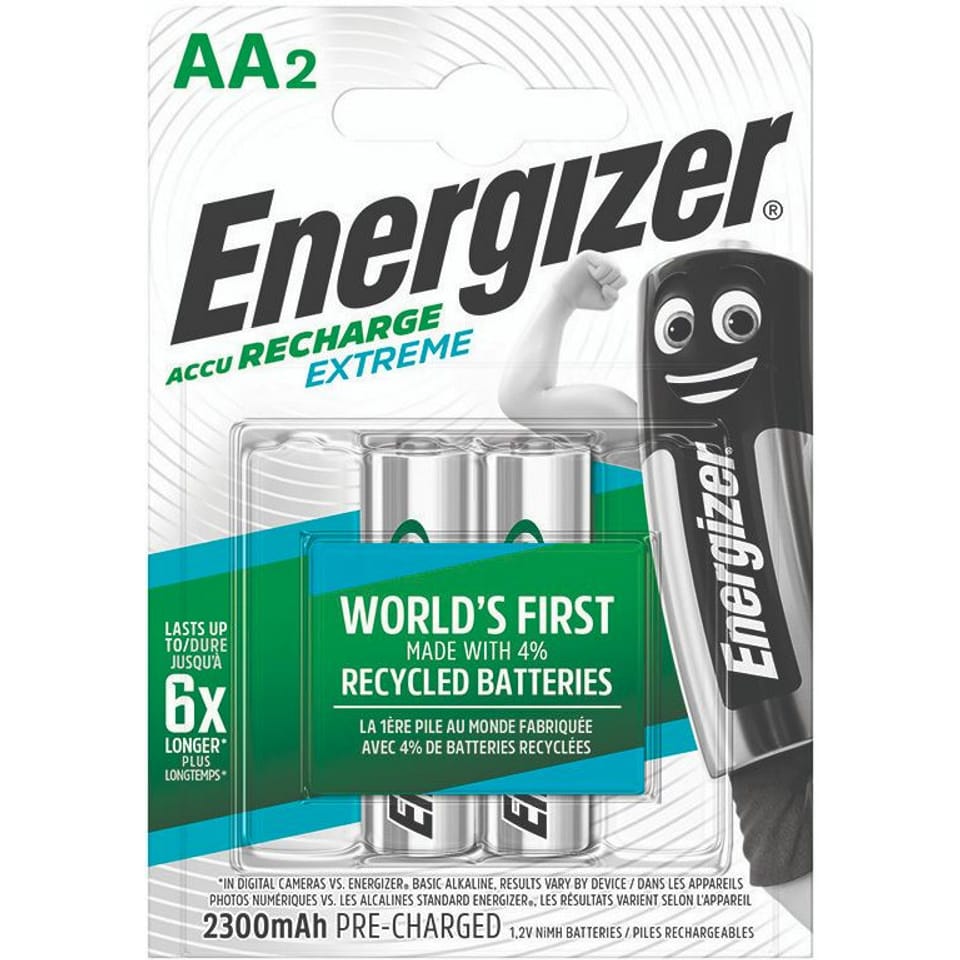 * akumulatorki EXTREME AA HR6 ENERGIZER * innowacyjne akumulatorki wykorzystują nową, opatentowaną technologię SUPER LATTICE ALLOY (nadstruktury stopowe), dzięki nowemu składowi chemicznemu możliwe jest większe zagęszczenie składników * zastosowanie czystych materiałów, pozwala również ograniczyć odpady powstające w reakcji chemicznej * 2 sztuki akumulatorków zastępują do 1600 baterii alkalicznych * wytrzymują do 6 razy dłużej w aparatach cyfrowych * mogą być ładowane setki razy * dostarczają dużą moc dla urządzeń o dużym poborze * świetnie nadają się do aparatów cyfrowych, urządzeń GPS, latarek itp. * utrzymują moc do jednego roku, oferując moc wtedy, kiedy będzie potrzebna * wstępnie naładowane * gotowe do użycia w momencie zakupu * wyprodukowane w technologii, która zapewnia działanie akumulatorka do 5 lat * typ: HR6 * rozmiar: AA * napięcie: 1,2 V * pojemność: 2300 mAh * jednostka sprzedaży 2 sztuki * firma ENERGIZER powstała w 1886 roku w USA, jest jednym z największych na świecie producentów, zaawansowanych technologicznie i wysokiej jakości, baterii i latarek