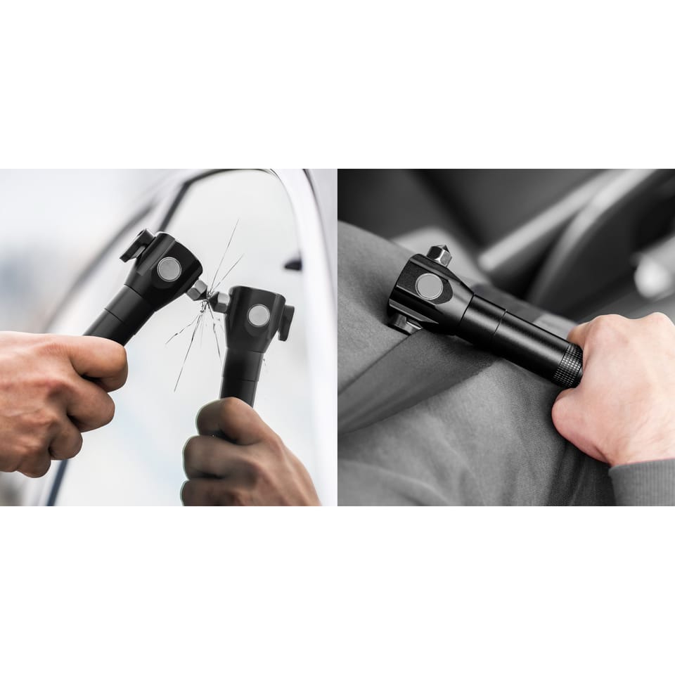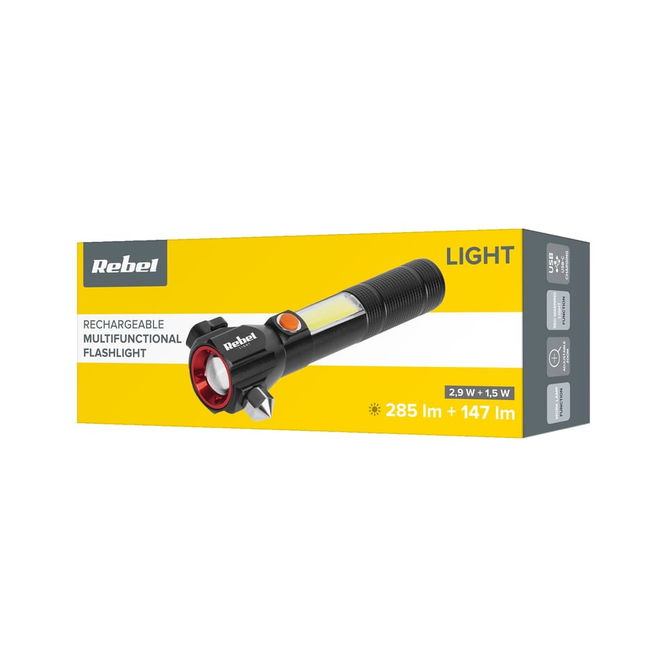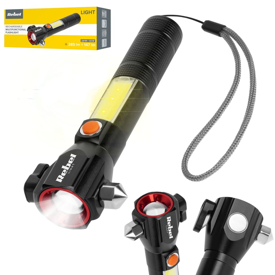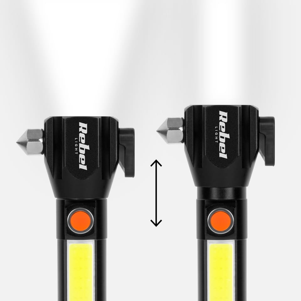 Akumulatorowa latarka wielofunkcyjna Rebel zoom, nożyk, młotek do szyby)