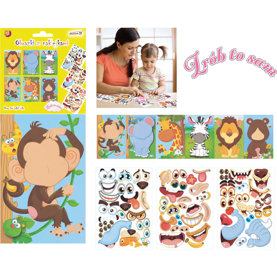 Album "Zrób to sam". Album zawiera 9 kartek: 6 obrazków ze wzorami zwierzątek 3 plansze z naklejkami. Rozmiar: 14cm x 25cm