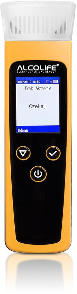 Alkomat ALCOLIFE GO jest przeznaczony do badań bezustnikowych dużych grup ludzi. Idealny do szybkich badań przesiewowych, jest używany przez firmy budowlane, transportowe, produkcyjne oraz służby publiczne. Nowoczesny europejski sensor elektrochemiczny pozwala na przeprowadzenie pomiaru bezustnikowego w zaledwie 3 sekundy, umożliwiając badanie ponad pół tysiąca osób na godzinę. ALCOLIFE GO wyposażony jest w duży, czytelny wyświetlacz o trzech kolorach. W zależności od wyniku badania, zmienia on kolor na zielony, biały lub czerwony, wyświetlając dokładne wyniki w formie liczb. To rozwiązanie umożliwia szybką i łatwą interpretację wyników, pokazując dokładnie ile alkoholu zawiera wydychane powietrze. Ten model alkomatu ma funkcję zapisu do 28 000 testów z pomiarów. Dane te mogą być zaimportowane do komputera przy użyciu dedykowanego oprogramowania (w wersji polskiej) lub wydrukowane na drukarce Bluetooth (dostępnej jako dodatkowy zakup). Zakres danych prezentowanych na wydruku zawiera m.in. wynik z pomiaru, datę, nazwę firmy lub właściciela, miejscowość, adres oraz imię i nazwisko osoby testowanej. ALCOLIFE GO oferuje darmową, nielimitowaną kalibrację przez pierwszy rok użytkowania. Regularna kalibracja jest kluczowa, aby zapewnić poprawność i precyzję wyników alkomatu. Aby utrzymać jakość pomiarów, należy przeprowadzać kalibracje zgodnie z zaleceniami producenta. To innowacyjne rozwiązanie jest szczególnie użyteczne dla firm Odpowiedni dla organizacji które muszą regularnie przeprowadzać badania przesiewowe na obecność alkoholu. Dzięki szybkim pomiarom, dużej pojemności pamięci i elastycznym opcjom drukowania, ALCOLIFE GO jest idealnym narzędziem do utrzymania bezpieczeństwa i zgodności z regulacjami. Alkomat prezentuje wyniki na wyświetlaczu (np. 0.00 promila, 0.20 promila, 2.00 promile) Alkomat posiada system umożliwiający badanie osób nieprzytomnych. Jest to funkcja szczególnie przydatna, w przypadku osób u których występuje problem z wdmuchnięciem minimalnej ilości powietrza. Alkomat może również wykonać test na obecność alkoholu w pojemnikach z płynami Zalety alkomatu ALCOLIFE GO Sensor elektrochemiczny: Technologia stosowana w alkomatach policyjnych, zapewniająca wysoką precyzję pomiarów. Szybkość pomiaru: Bezustnikowy test trwa tylko 3-4 sekundy, co jest bardzo wydajne. Magnes do przyczepienia: Alkomat można łatwo umieścić na metalowych powierzchniach, co ułatwia przechowywanie i dostępność. Wielofunkcyjność: Możliwość badania na obecność alkoholu w pojemnikach z płynami, a także zmiany jednostki pomiarowej (mg/L, mg/100mL, ‰, %). Doskonały stosunek jakości do ceny: Produkt oferuje wiele funkcji w atrakcyjnej cenie. Dodatkowe Funkcje Wyświetlacz: Duży, czytelny LCD z trójkolorowym podświetleniem. Wyniki są wyraźnie wyświetlane. Pamięć pomiarów: Alkomat umożliwia zapisanie do 28 000 wyników pomiarów, co pozwala na późniejsze analizy. Kompatybilność z drukarką Bluetooth: Opcja dodatkowo płatna, umożliwia drukowanie wyników pomiarów. Oprogramowanie dedykowane: Pozwala na pobieranie danych z alkomatu do komputera w celu przechowywania i analizy. Automatyczne wyłączanie: Funkcja oszczędzająca energię, wyłącza urządzenie po 3 minutach bezczynności. Dodatkowe Korzyści System kontroli długości pomiaru: Długość pomiaru jest sygnalizowana dźwiękiem, co pomaga w prawidłowym przeprowadzeniu testu. Pokrowiec i pasek na rękę: Ułatwia przechowywanie i przenoszenie alkomatu. Gwarancja: 3 lata na alkomat i 2 lata na sensor, zapewniające spokój użytkownika. Nielimitowana kalibracja: Pierwszy rok kalibracji jest darmowy, co zapewnia precyzyjne wyniki przez długi czas.