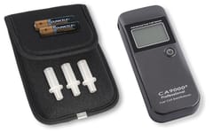 CA9000 Professional jest zasilany z 2 x 1.5V baterii typu AAA. Alkomat posiada również sygnalizację niskiego napięcia zasilania oraz funkcję automatyczne odcięcia zasilania po upływie 20 sek. bezczynności.