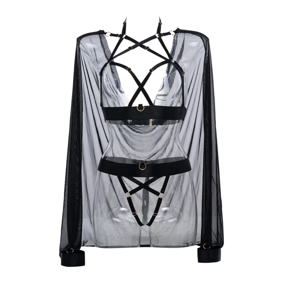 Allure Sweet Little Lies to wyjątkowy zestaw składający się z anatomicznie zaprojektowanej uprzęży oraz pelerynki wykonanej z eleganckiej, prześwitującej siateczki. Model ten wyrożnia się starannym wykonaniem oraz wysoką jakością użytych materiałow, co gwarantuje wygodę użytkowania oraz trwałość. Dzięki zastosowaniu złotych suwakow i precyzyjnych zapięć, zestaw można z łatwością regulować i dopasować do sylwetki, podkreślając indywidualny styl.